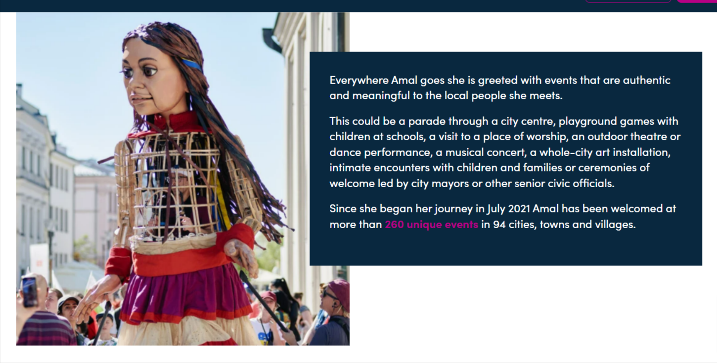 Little Amal is a 12-foot puppet of a 10-year-old Syrian refugee girl who has traveled across 13 countries meeting more than a million people, and watched by tens of millions more online. This fall, she will journey 6,000 miles across the United States in one of the largest free public festivals ever created. 35 towns and cities from Boston to San Diego and 1,000+ artists and arts organizations will create 100+ events to welcome her. Amal’s journeys of art and hope celebrate the rich stories of refugees, immigrants, and displaced people, and the communities that welcome them. Everyone is welcome to walk with Amal.